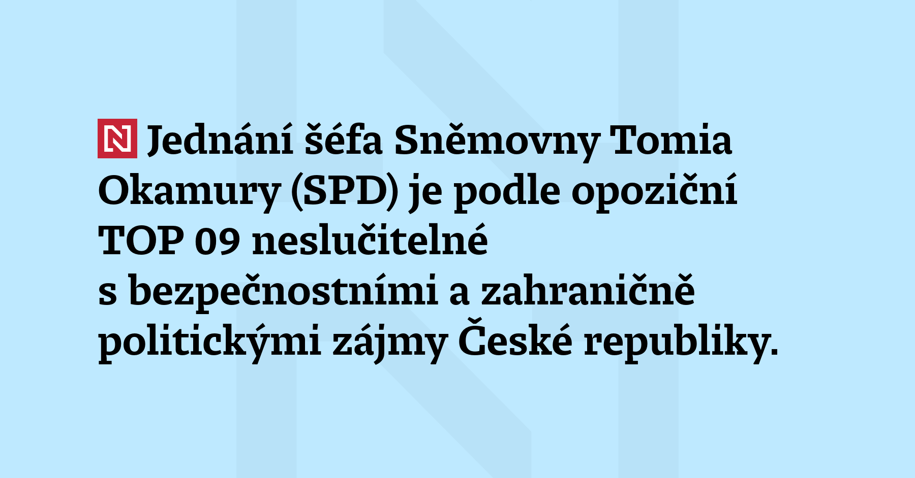 Jednání šéfa Sněmovny Tomia Okamury (SPD) je podle opoziční TOP 09 neslučitelné s bezpečnostními a zahraničně politickými zájmy České republiky. Strana chce jeho odvolání. (ČTK)
