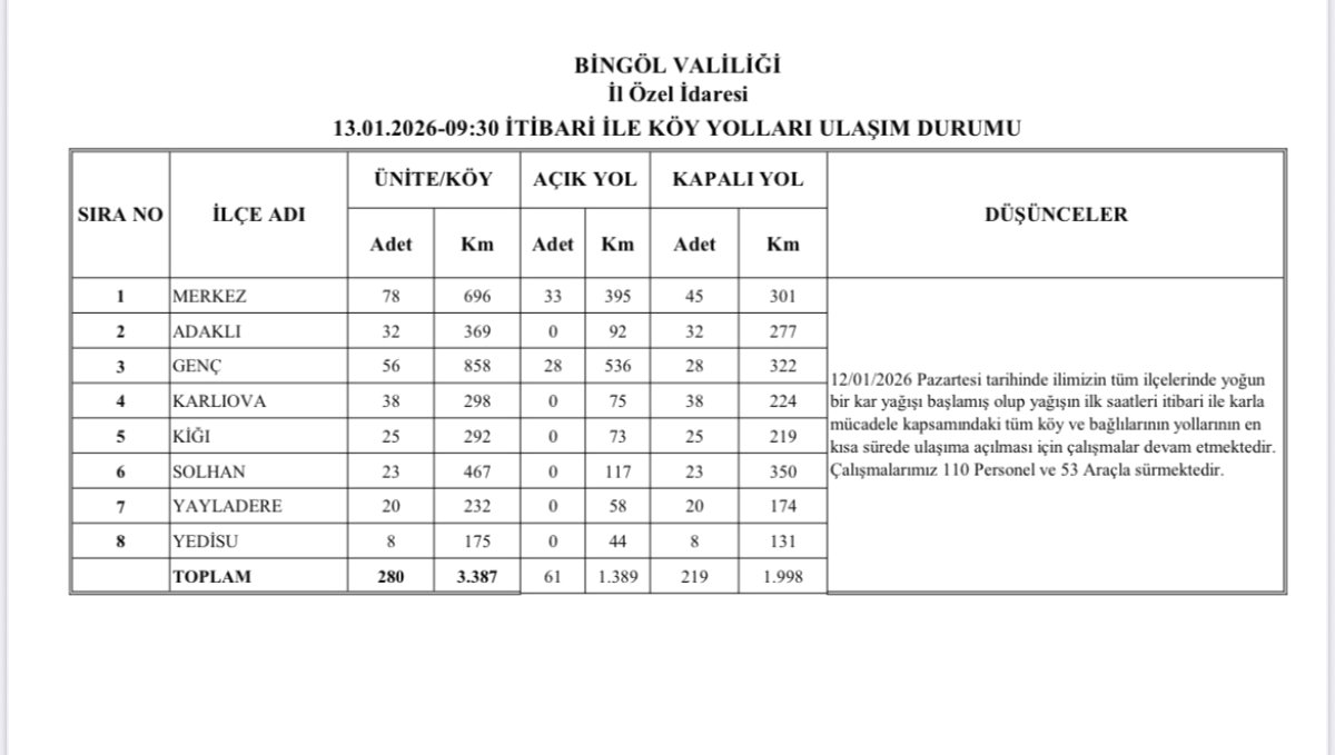 Bingöl'de etkili olan kar yağışı sonrası 219 köy yolu ulaşıma kapanırken, İl Özel İdaresi ekipleri çalışmalarını aralıksız sürdürüyor.
