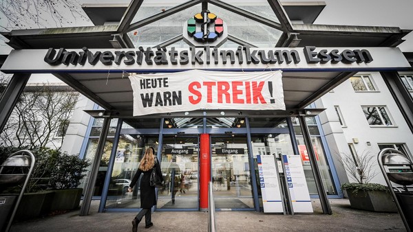 Mehr als 200 Beschäftigte haben sich am Dienstag (13.1.) an einem Warnstreik an der Uniklinik Essen beteiligt. Das Krankenhaus muss Operationen absagen.