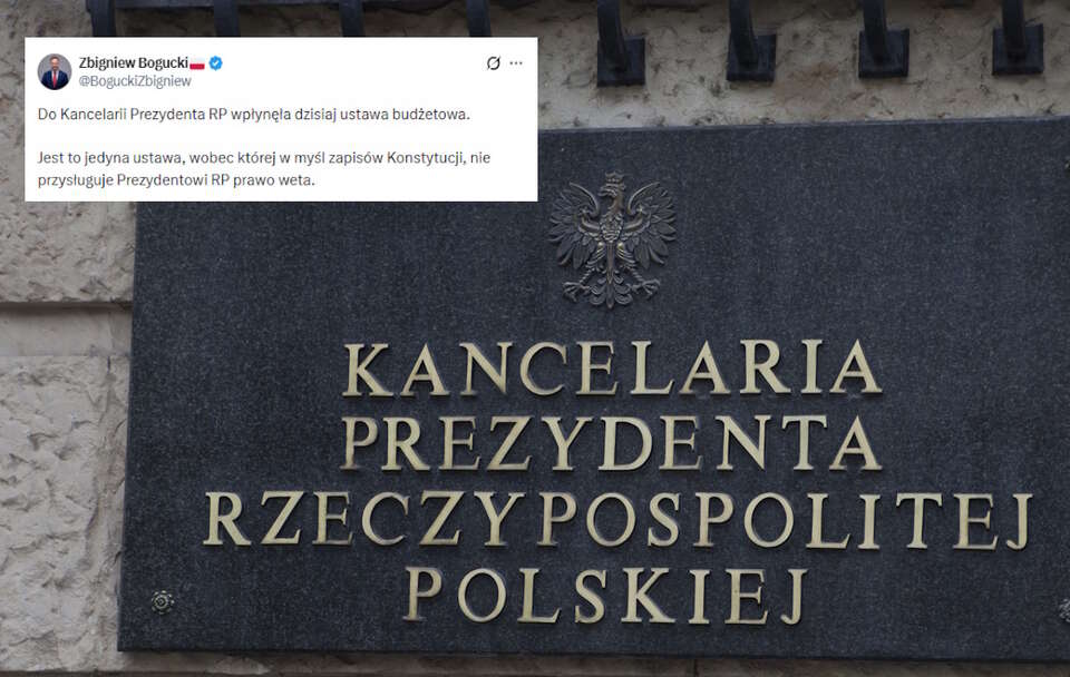 Do Kancelarii Prezydenta RP wpłynęła dzisiaj ustawa budżetowa na 2026 r. - poinformował szef kancelarii prezydenta Zbigniew Bogucki. Przypomniał, że to jedyna ustawa, wobec której prezydentowi nie przysługuje prawo weta. Prezydent może jej jednak nie podpisać i odesłać do Trybunału Konstytucyjnego.