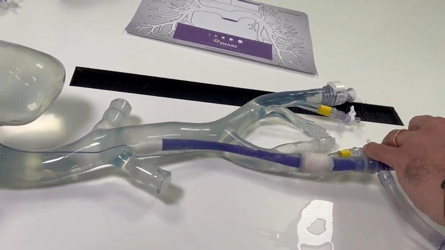 El doctor Francesco Costa, cardiólogo de la Unidad Hemodinámica del Hospital Clínico de Málaga y uno de los profesionales impulsores del ‘Código TEP’, realiza una demostración de cómo funciona la trombectomía mecánica y de cómo se extrae el trombo a través de esta técnica