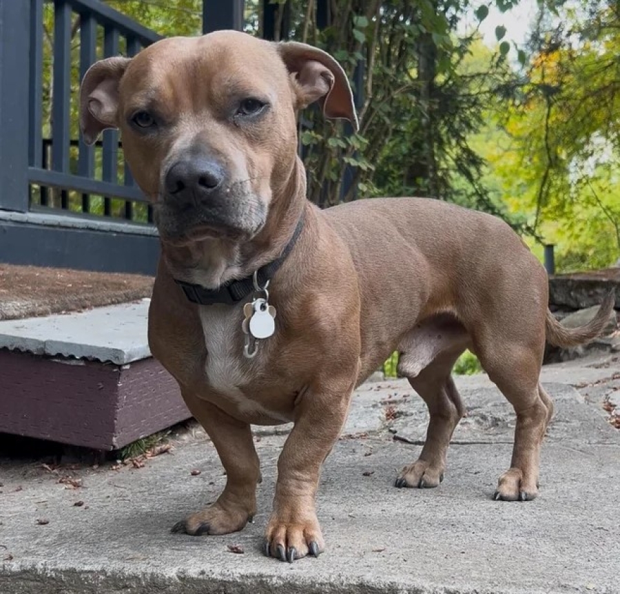 Njegova glava podsjeća na pit bula, dok mu tijelo, dugo i nisko, podsjeća na jazavičara