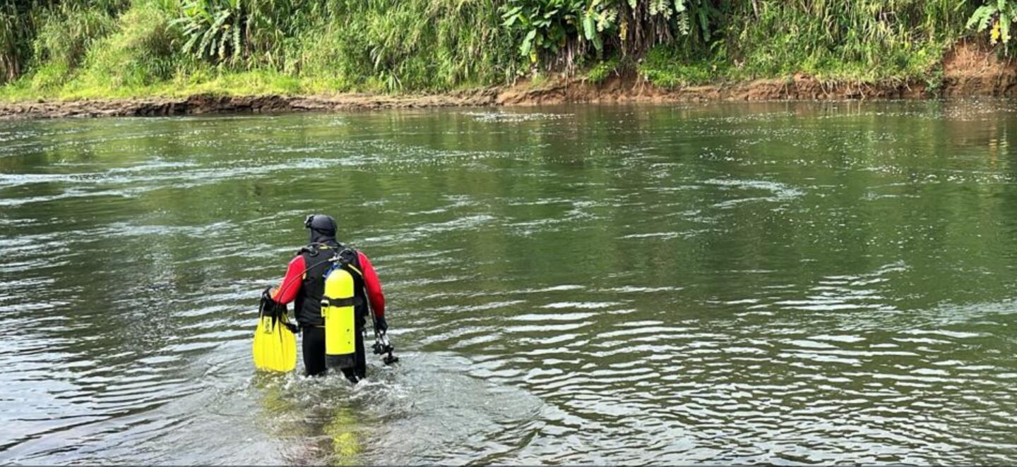 Socorristas de la Cruz Roja mantienen la búsqueda de un pescador que fue arrastrado por una corriente en el río Reventazón.