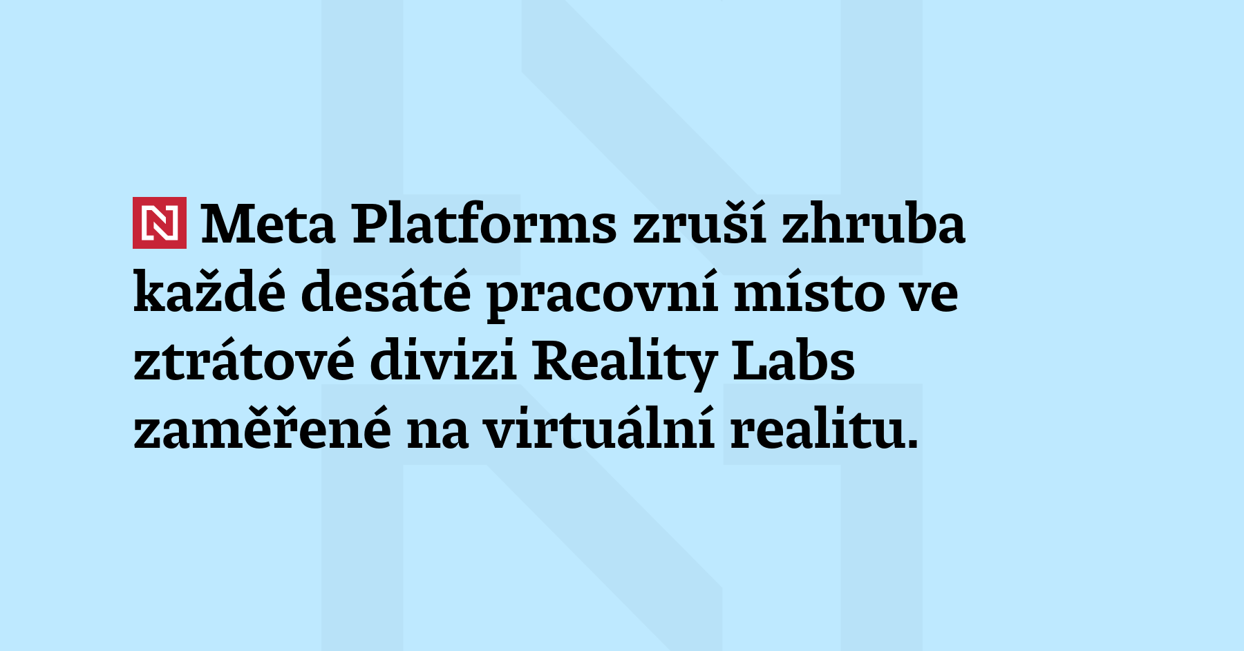 Meta Platforms zruší zhruba každé desáté pracovní místo ve ztrátové divizi Reality Labs zaměřené na virtuální realitu. Redukce se má dotknout zhruba 1 000 pracovníků. Mluvčí koncernu tak potvrdil informace agentury Bloomberg, podle nichž firma utlumuje investice do světa metaverse a prioritně se orientuje na rozvoj umělé inteligence. (Bloomberg)