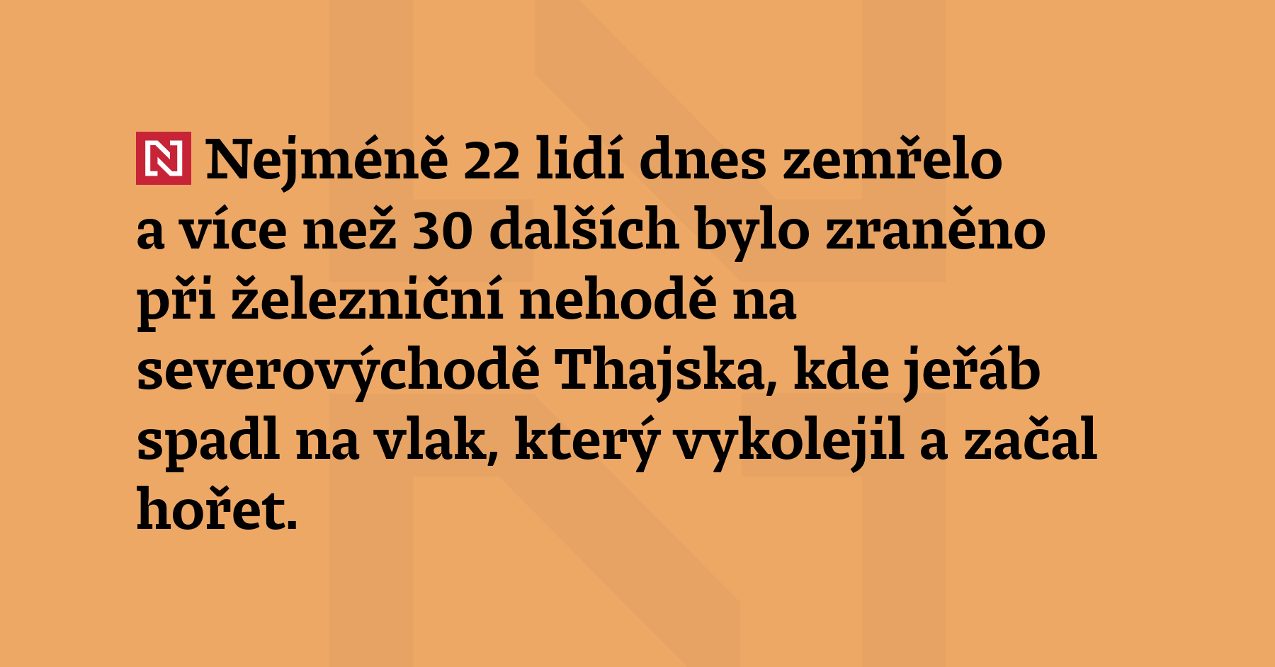 Nejméně 22 lidí dnes zemřelo a více než 30 dalších bylo zraněno při železniční nehodě na severovýchodě Thajska, kde jeřáb spadl na vlak, který vykolejil a začal hořet. S odvoláním na úřady to napsala agentura AFP. Podle agentury Reuters zemřelo 19 osob a zraněno bylo asi 80 dalších. (ČTK)