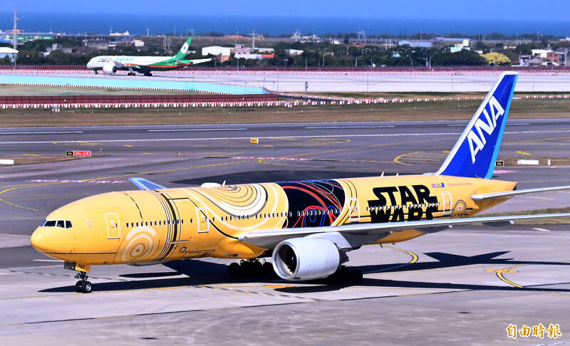 全日空(ANA)星際大戰彩繪機C-3PO ANA JET今日中午飛抵桃園機場,將由長榮航太為其卸除塗裝,這架被暱稱為「たくあん(醃蘿蔔)」的彩繪機是首次來台,吸引不少航迷與...…
