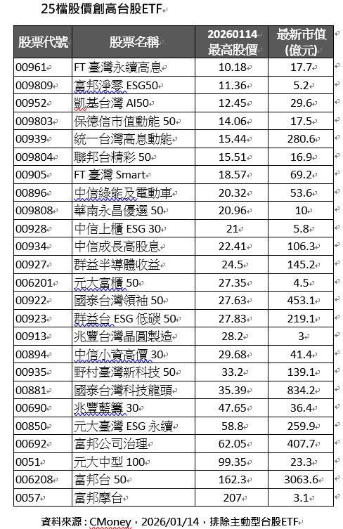 台股屢創高峰 25檔台股ETF股價同創新高