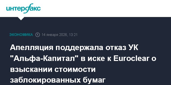 Девятый арбитражный апелляционный суд в среду поддержал решение Арбитражного суда Москвы, отказавшего 15 августа 2025 года УК "Альфа-Капитал" в иске к европейскому депозитарию Euroclear Bank о взыскании стоимости заблокированных ценных бумаг."Оставить решение суда без изменения, жалобу без удовлетворения", - говорится в информации на сайте суда.