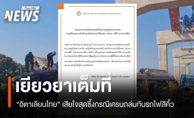 วันนี้ (14 ม.ค.2569) บริษัท อิตาเลียนไทย ดีเวล๊อปเมนต์ จำกัด (มหาชน) ออกแถลงการณ์ขอแสดงความเสียใจอย่างสุดซึ้งต่อการสูญเสียและบาดเจ็บจากอุบัติเหตุเครนก่อสร้างตกทับขบวนรถไฟโดยสาร บริเวณ อ.สีคิ้ว จ.นครราชสีมา บริษัท อิตาเลียนไทย ดีเวล๊อปเมนต์ จำกัด (มหาชน) ขอแสดงความเสียใจอย่างสุดซึ้ง ต่อการสูญเสียและบาดเจ็บ กรณีอุบัติเหตุเครนก่อสร้างตกทับขบวนรถไฟโดยสาร บริเวณ อ.สีคิ้ว จ.นครราชสีมา บริษัทฯ พร้อมแสดงความรับผิดชอบที่จะให้การช่วยเหลือในการชดเชยเยียวยาให้กับครอบครัวผู้สูญเสียและการรักษาพยาบาลผู้ที่ได้รับบาดเจ็บอย่างเต็มที่ และบริษัทฯ พร้อมที่จะให้การสนับสนุนเจ้าหน้าที่ทุกภาคส่วน เพื่อเร่งดำเนินการแก้ไขให้สถานการณ์กลับเข้าสู่สภาวะปกติโดยเร็ว อ่านข่าว : ส.วิศวกรฯ เผย 4 สาเหตุ เครนก่อสร้างสีคิ้วถล่ม สธ.แถลงเครนถล่มทับรถไฟสีคิ้ว เสียชีวิต 22 เจ็บ 64 คน อายุน้อยสุด 1 ขวบ รมว.แรงงานสั่งดูแลสิทธิประโยชน์ "ผู้เสียชีวิต-บาดเจ็บ" เหตุเครนถล่มทับรถไฟ