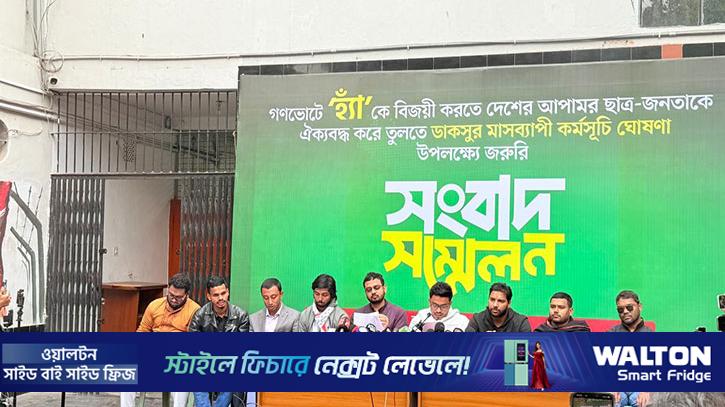 জাতীয় গণভোটে ‘হ্যাঁ’ ভোটকে বিজয়ী করতে দেশজুড়ে মাসব্যাপী ১৫টি কর্মসূচি ঘোষণা করেছে ঢাকা বিশ্ববিদ্যালয় কেন্দ্রীয় ছাত্র সংসদ (ডাকসু)। জনগণের অংশগ্রহণ ও সচেতনতা বাড়াতে এসব কর্মসূচি নেওয়া হয়েছে।