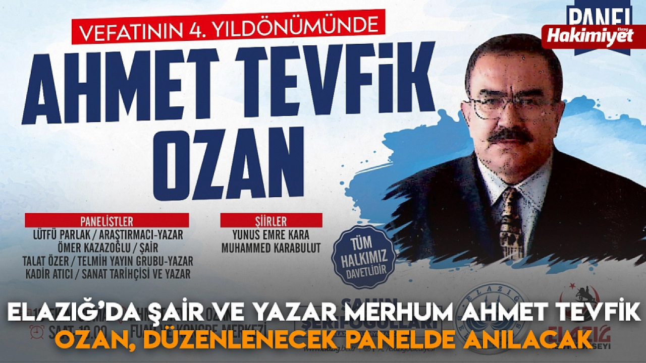 Elazığ’ın yetiştirdiği bilim ve kültür insanı Şair ve Yazar Merhum Ahmet Tevfik Ozan, vefatının 5. yılında düzenlenecek panelle anılacak.