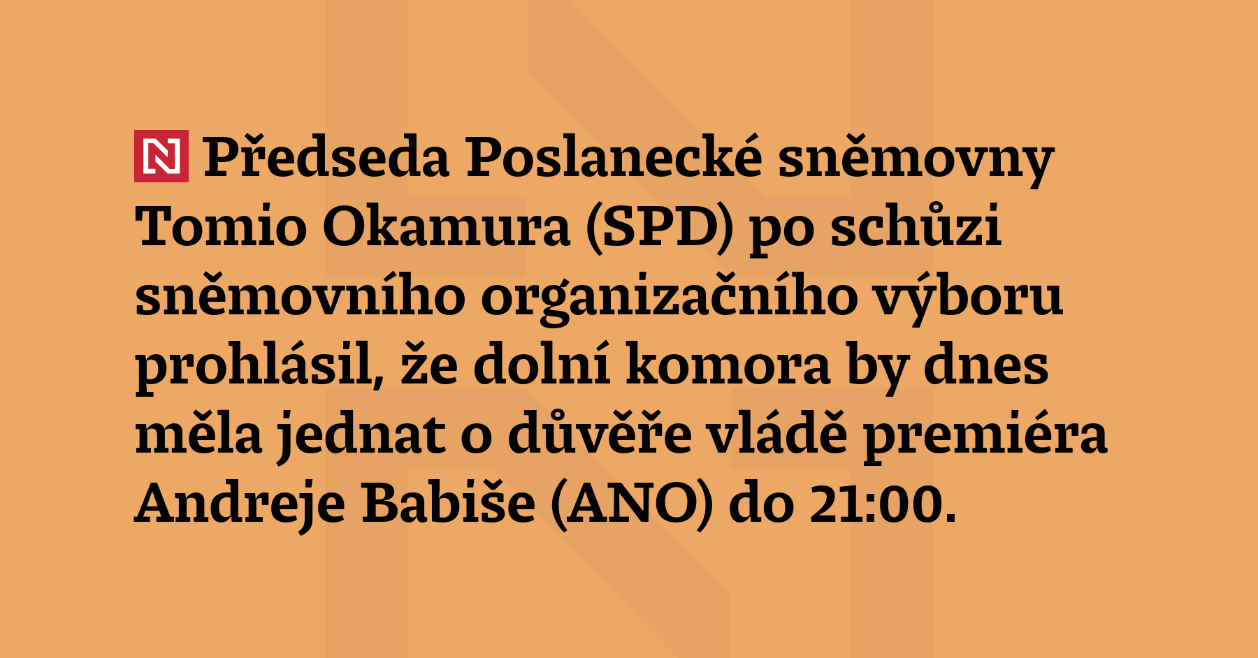 Předseda Poslanecké sněmovny Tomio Okamura (SPD) po schůzi sněmovního organizačního výboru prohlásil, že dolní komora by dnes měla jednat o důvěře vládě premiéra Andreje Babiše (ANO) do 21:00. Pokračovat bude v jednání i ve čtvrtek. (ČT24)