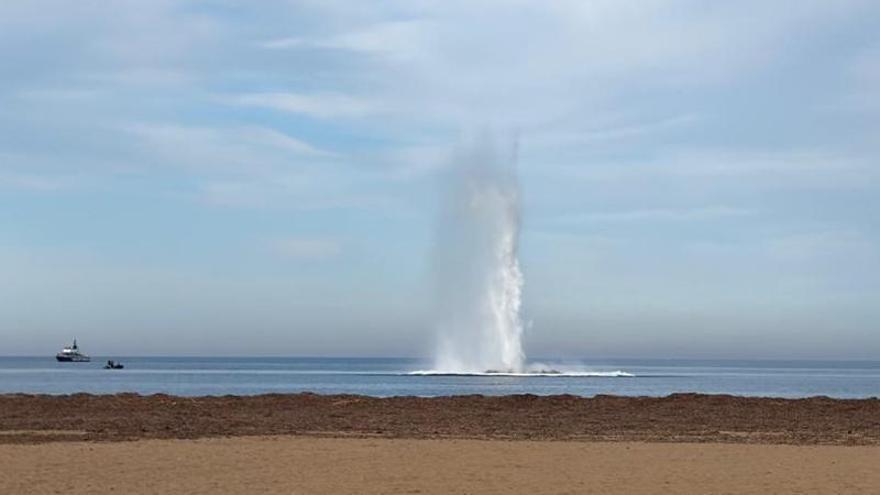 Los responsables del dispositivo se han cerciorado de que todo estaba despejado y luego han realizado la cuenta atrás. Pasadas las 15 horas, se ha realizado la explosión controlada del obús que ha localizado un buceador en la playa del Raset de Dénia. Artificieros de los Tedax de la Guardia Civil y de la Armada la han detonado. En tierra, han acordonado toda la playa agentes de la Policía Nacional y de la Policía Local. Espectacular despliegue. La explosión ha provocado un géiser y una sacudida en la orilla. Quienes estaban allí, tras el cordón de seguridad, han sentido la vibración.