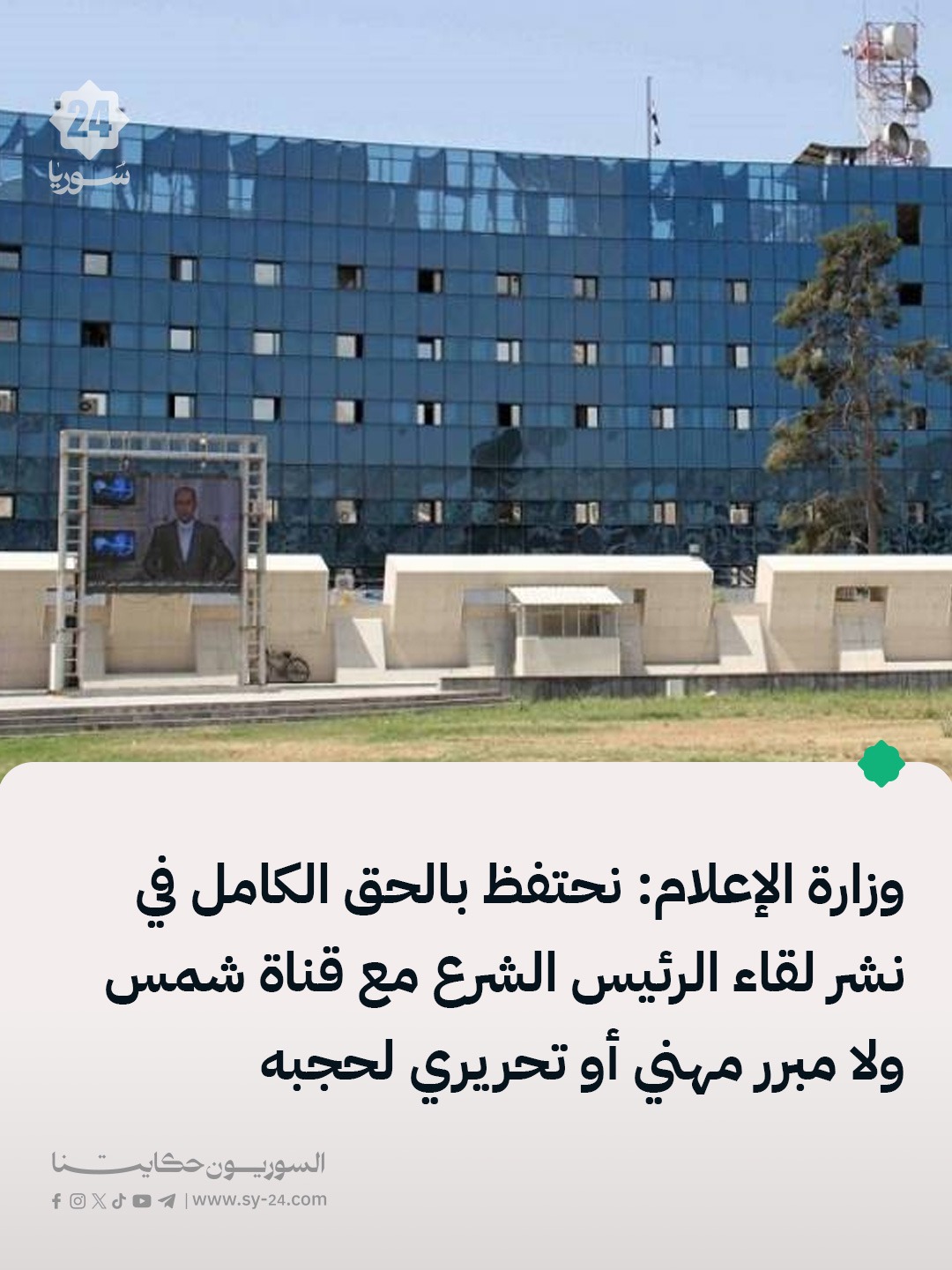 وزارة الإعلام: تابعَت وزارة الإعلام قرار قناة “شمس” الاعتذار عن بث لقاء مع الرئيس الشرع بناءً على تقديراتها السياسية الخاصة. اللقاء تم في إطار من الحريات والانفتاح، حيث أجاب الرئيس على جميع الأسئلة دون قيود. اختيار الرئيس لقناة كردية يعكس تأكيداً على مكانة الكرد ودورهم وحقوقهم، وأن العلاقة معهم تتجاوز الإطار التنظيمي. الضغوط غير التحريرية […] The post تابعَت وزارة الإعلام قرار قناة “شمس” الاعتذار عن بث لقاء مع الرئيس الشرع بناءً على تقديراتها السياسية الخاصة. appeared first on SY24 .