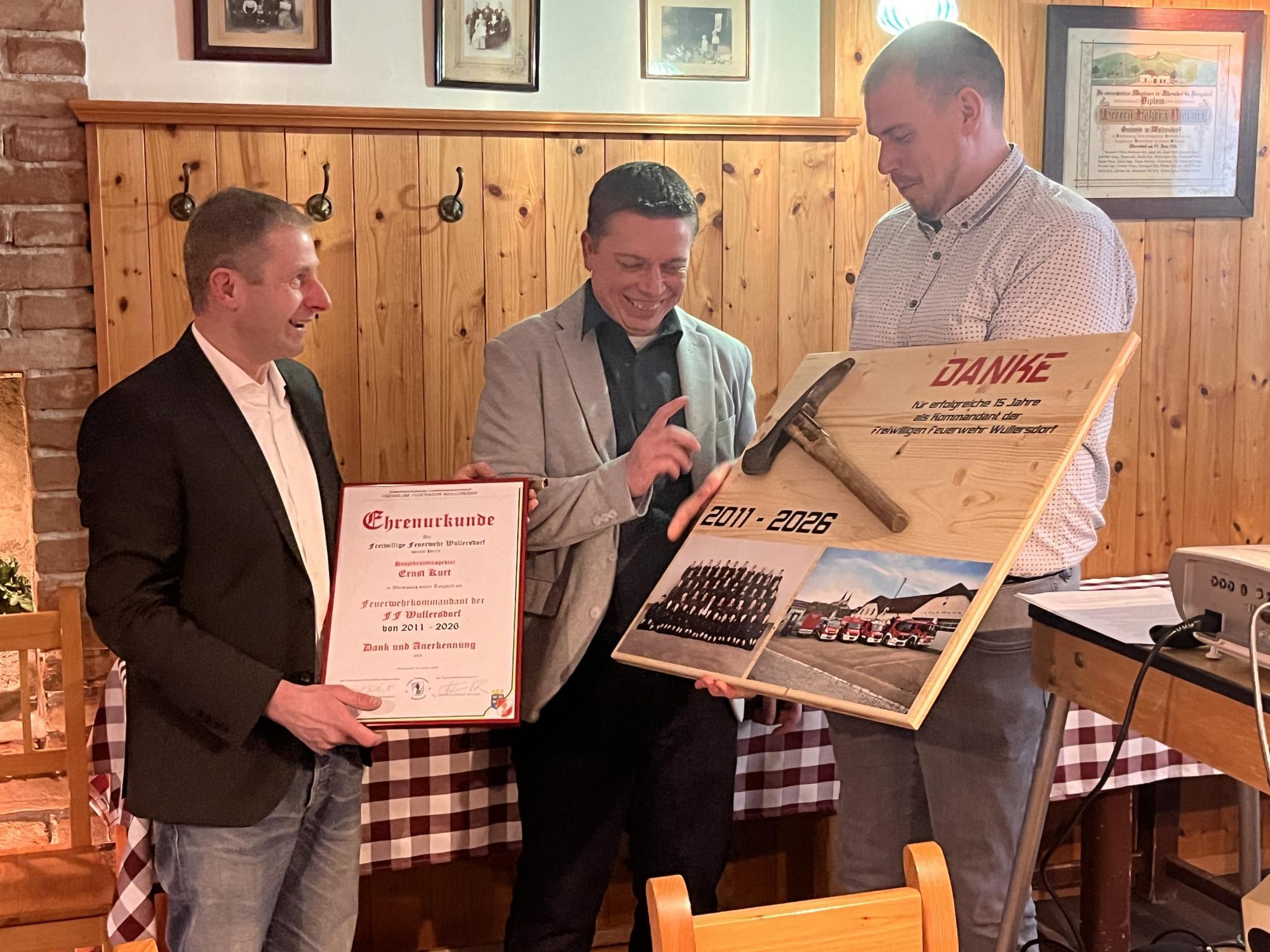 "Man soll aufhören, wenn es am Schönsten ist." Mit diesem Spruch beendete Kurt Ernst nach 15 Jahren seine Amtszeit als Kommandant der Freiwilligen Feuerwehr Wullersdorf (Bezirk Hollabrunn) . Mit seinem Wissen und seiner Erfahrung wird er der Wehr erhalten bleiben. Sein langjähriger Stellvertreter Markus Zahlbrecht wurde von den Kameraden zum neuen FF-Chef gewählt. Seine 15 Jahre als Kommandant seien von Zusammenhalt, Weiterentwicklung und gemeinsamen Herausforderungen geprägt gewesen, sagte Ernst in seinem Rückblick. Der Abschied von der Spitze der Feuerwehr fällt ihm nicht schwer, denn er lebt nach dem Motto: "Führen bedeutet auch, andere zu entwickeln, um führen zu können." Erfahrener Feuerwehrmann an der Spitze der Wullersdorfer Wehr Dass sein Nachfolger Markus Zahlbrecht die FF-Mitglieder führen kann, hat er als Stellvertreter bewiesen. Außerdem ist er seit Jahren als Abschnittsfeuerwehrkommandant aktiv sowie Chef des Landes- und Bezirksführungsstabs und Mitglied des Arbeitsausschusses Katastrophenhilfsdienst. Zum Stellvertreter wurde Christof Vietze gewählt. Gerd Schnötzinger wurde zum neuen Verwalter ernannt, unterstützt von Norbert Pimberger als dessen Stellvertreter. Die Feuerwehr Wullersdorf zählt derzeit 82 Mitglieder, davon sind 47 aktive, 21 gehören der Feuerwehrjugend an und 14 sind Reservisten. Altkommandant Kurt Ernst berichtete, dass seine Wehr 2025 insgesamt 80 Einsätze bewältigt hat, bei denen 627 Einsatzstunden geleistet wurden. Zusätzlich investierten die Mitglieder beinahe 1.300 Stunden in Aus- und Weiterbildungen. Insgesamt wurden im vergangenen Jahr rund 7.300 freiwillige Stunden zum Wohle der Bevölkerung erbracht. Neue Schleifkorbtrage und Einsatz-Tablets Geplante Investitionen und Ausbildungsschwerpunkte waren Thema bei der Feuerwehrversammlung: Eine neue Schleifkorbtrage soll angekauft werden, da die aktuelle bereits in die Jahre gekommen ist. Die im vergangenen Jahr durch die Anschaffung des LAST-Fahrzeuges zurückgestellte Beschaffung neuer Einsatzhosen soll im ersten Halbjahr 2026 umgesetzt werden. Im Zuge der Digitalisierung durch das Landesfeuerwehrkommando Niederösterreich werden Tablets für Einsatzfahrzeuge zur Verfügung gestellt, damit werden dann alle einsatzrelevanten Fahrzeuge der FF Wullersdorf mit Einsatz-Tablets ausgestattet werden. Planungen für 150-Jahr-Feier beginnen Der Ausbildungsschwerpunkt liegt in diesem Jahr auf der Menschenrettung aus Kraftfahrzeugen und soll im zweiten Halbjahr mit der Ausbildungsprüfung „Technischer Einsatz“ abgeschlossen werden. Darüber hinaus richtete sich der Blick bereits auf die kommenden Jahre, insbesondere auf die 150-Jahr-Feier im Jahr 2027 sowie auf den Start der Planungen für ein neues HLF3.