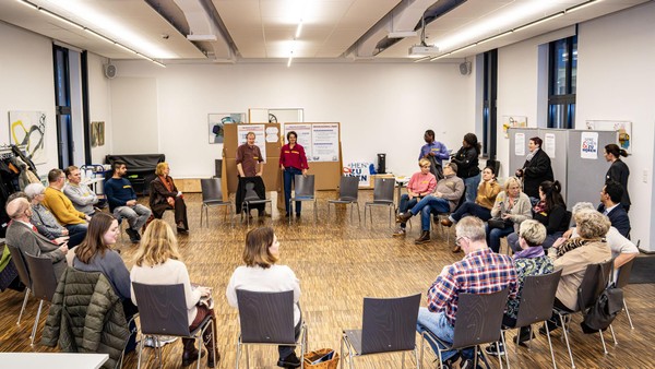 Im Schirrhof trafen sich Kamp-Lintforter, um über den Zusammenhalt in der Stadt zu sprechen. Warum auf dem Wunschzettel eine Szene-Kneipe steht.