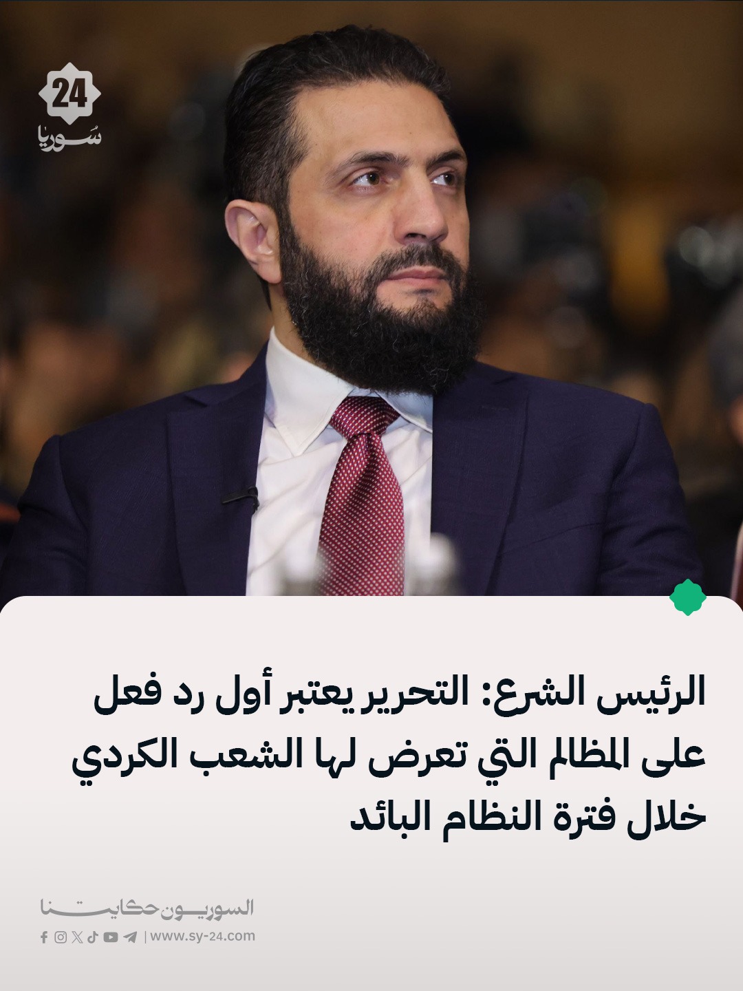 الرئيس أحمد الشرع: التحرير يعتبر أول رد فعل على المظالم التي تعرض لها الشعب الكردي لأنه مثل إسقاط منظومة ظلم اعتمدت ممارسات سيئة تجاه المكون الكردي المكون الكردي عانى خلال سنوات الثورة السورية كباقي فئات الشعب السوري خاصة من بعض الفصائل المنفلتة فعلت كل ما أستطيع لحماية المكون الكردي خلال سنوات الثورة في شمال غرب […] The post التحرير يعتبر أول رد فعل على المظالم التي تعرض لها الشعب الكردي appeared first on SY24 .