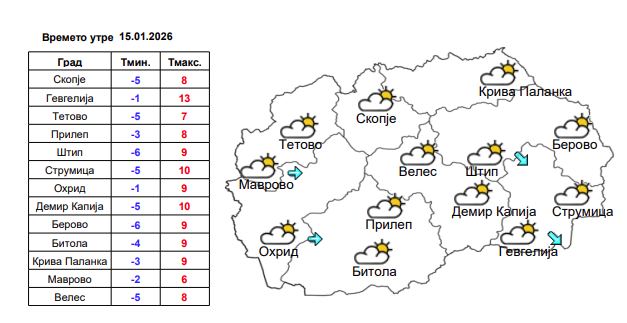 Утре времето ќе биде сончево со мала до умерена локална облачност, а по одделни котлини ќе има услови за појава на утринска магла. Ќе дува слаб до умерен ветер од западен и северозападен правец. Во Скопје, во утринските часови во делови од котлината е можно појава на магла, додека преку денот ќе преовладува сончево и тивко време со мала облачност. Во петок ќе се задржи стабилно и потопло време, со појава на утринска магла по котлините, а за време на викендот се очекува зголемена облачност и повремени локални врнежи од дожд, додека на планините ќе врне снег. Дневните температури повторно ќе бидат во опаѓање.