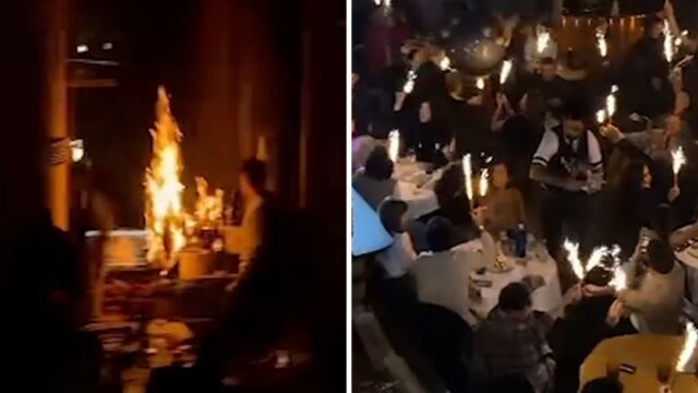 Στις φλόγες τυλίχτηκε κουρτίνα σε εστιατόριο στη Μαδρίτη, τη στιγμή που πελάτες κρατούν πυροτεχνήματα εσωτερικού χώρου και τα κραδαίνουν στον ρυθμό της μουσικής