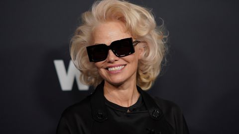 Pamelas Andersones izvēlētais tēls balstās uz melnas krāsas total look — plūstošu siluetu ar militāri iedvesmotu struktūru, kas vienlaikus ir gan stingrs, gan sievišķīgi maigs.