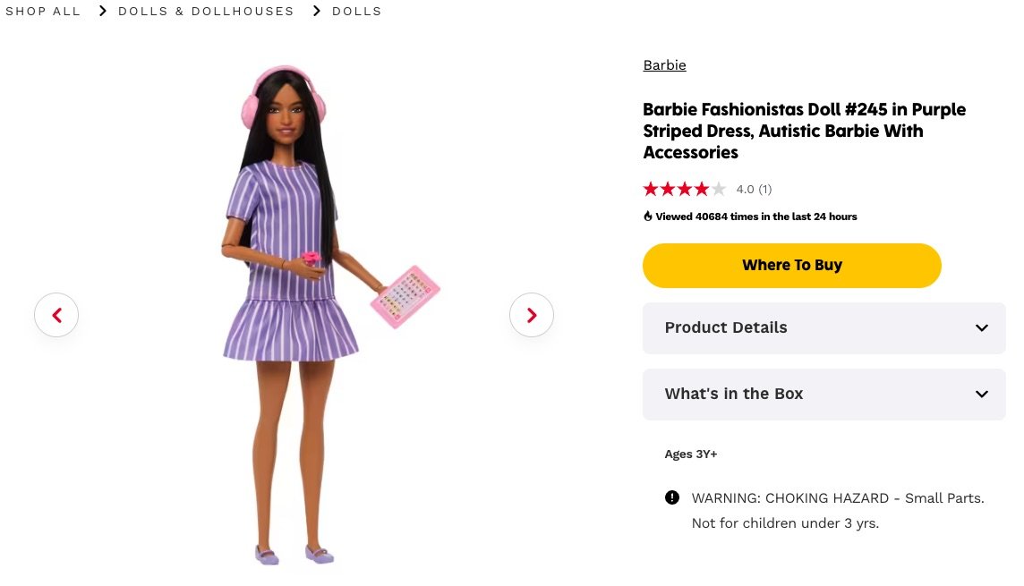 바비 인형으로 유명한 세계 최대 완구기업 마텔이 브랜드 역사상 처음으로 ‘자폐증 바비’ 인형을 공개했다.11일(현지 시간) 마텔은 자사 홈페이지를 통해 이렇게 밝히면서, “비영리 장애 인권 단체인 자폐 자기옹호 네트워크(ASAN)와 18개월 이상 협력해 개발된 이 인형은 다양한 피부 톤, 모발 질감, 체형, 폭넓은 다양성을 갖춘 ‘바비 패셔니스타’ 컬렉션에 합류한다”고 설명했다.자폐증 바비 인형은 일부 자폐인들이 감각을 느끼거나 흥분할 때 보이는 스티밍, 손 퍼덕임 등의 동작을 표현할 수 있도록 만들어졌다.또 인형의 시선은 일부 자폐인들이 직접적으로 눈 맞춤을 피하는 경향이 있다는 것을 감안해 약간 옆으로 향해 있다. 손에는 불안 증세를 보이는 사람들이 자주 만지는 장난감인 피젯 스피너도 쥐어져 있다.이번 출시를 기념해 마텔은 자폐증 바비 인형 1000개 이상을 워싱턴 D.C. 어린이 국립병원, 로스앤젤레스 어린이병원 등 자폐 아동 전문 서비스를 제공하는 주요 소아 병원에 기
