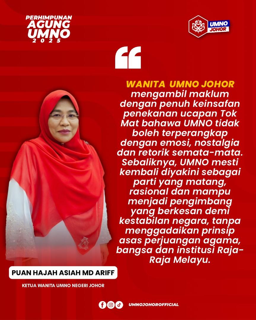 KUALA LUMPUR, 15 Jan – Wanita UMNO Johor menyatakan sokongan penuh terhadap ucapan perasmian serentak oleh Timbalan Presiden UMNO, Datuk Seri Mohamad Hasan, sempena Perhimpunan Agung Wanita, Pemuda dan Puteri UMNO Malaysia 2025, yang disifatkan sebagai amanat strategik dalam memperkukuh hala tuju parti. Ketuanya, Asiah Md Ariff, berkata ucapan tersebut bukan sekadar peringatan politik, malah satu penilaian jujur dan realistik [...]