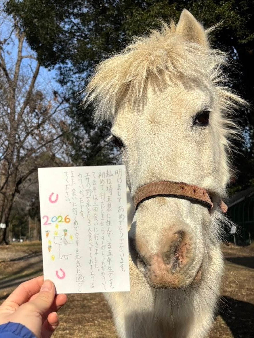 ポニーに届いた年賀状の内容が微笑ましいと、Xで話題になっています。 投稿したのは、茨城県石岡市にある観光牧場「ダチョウ王国 石岡ファーム」の公式アカウント(@Dacho_Oukoku)。写真には、白い毛並みのポニー・マーガレットちゃんと、彼女宛てに届いた1枚の年賀状が写っています。 年賀状の送り主は関東圏に住む小学生。文面には「マーガレットがかわいくて、去年は三回会いに行きました」「また会いに行くので、今年も元気に過ごしてください」といったメッセージがつづられ、マーガレットちゃんの似顔絵も添えられています。 ハフポスト日本版の取材に対し、担当者の石橋さんは「まさかマーガレットちゃん宛に年賀状が届くとは思っていなかったので、受け取った時はとても嬉しかったです」と振り返ります。なお、普段は新しいものに驚いてしまう性格だというマーガレットちゃんですが、このときは年賀状を近づけると、興味深そうに自ら歩み寄ってきたのだとか。 投稿には「この子もマーガレットちゃんも可愛すぎる♡」「目を細めて喜んでいるみたい」「この時代に手書きの年賀状がグッとくる」といった声が寄せられ、1.2万もの超える「いいね」が集まっています。 【画像】 これは絶対喜んでる 【あわせて読みたい】 「拾わないで下さい」ダンボールにすっぽり…ダチョウ王国の“箱入り子ヤギ”に「可愛すぎて語彙力失う」の声 Related... 【画像】小学生からの年賀状にポニー感激⇒嬉しそうな表情が「目を細めて喜んでいるみたい」と1.2万いいね ふわふわのポメラニアンが“メンチ切り”⇨睨むような表情に「目バキバキ」「戦闘モード突入!」 目覚めたらニワトリが見下ろしていた…!迫力の“安否確認”ショットに9万「いいね」 ...クリックして全文を読む