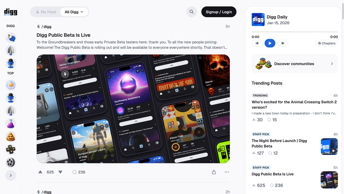 かつてGoogleの買収候補に名が上がるほどの勢いがありながらも消えていったソーシャルニュースサイト「Digg」の再始動計画が進み、現地時間2026年1月14日にパブリックベータ版が公開されました。 続きを読む...