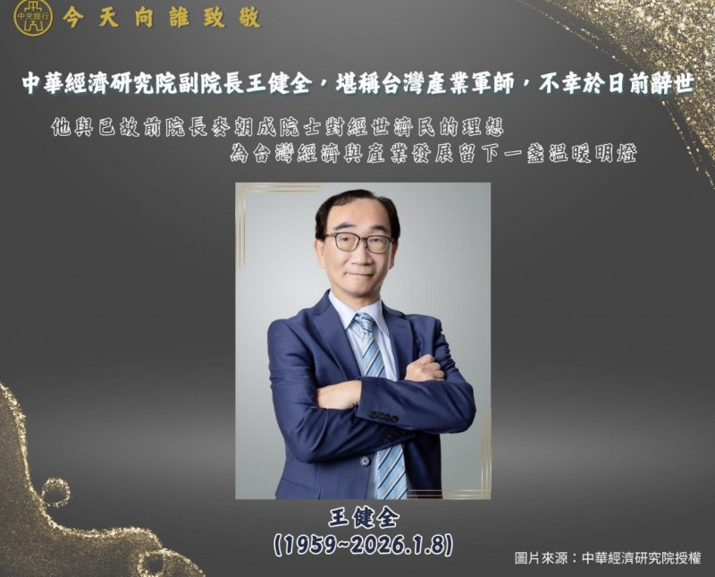 2026年1月8日,中華經濟研究院(簡稱中經院)副院長王健全因心肌梗塞辭世,享壽67歲。中央銀行今日在臉書「今天向誰致敬」單元,緬懷台灣產業軍師王健全,畢生奉獻於台灣產業...…