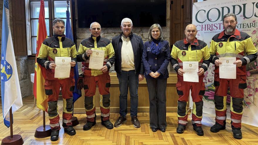 Cuatro bomberos del parque municipal de Ponteareas han sido distinguidos por el Ministerio del Interior por su entrega, profesionalidad y compromiso durante el operativo desplegado con motivo de la dana de Valencia. Son el jefe del parque, Roberto Castro Alonso, y los efectivos Carlos Carrera Novoa, José Rodríguez Cuña y Pablo Araujo Fernández.