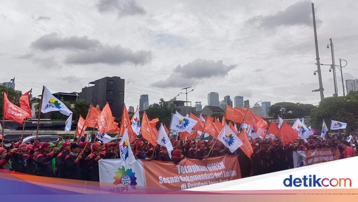 Ratusan massa aksi buruh melakukan aksi demonstrasi di kawasan DPR RI, Jakarta Pusat pada Kamis, 15 Januari 2026. Ini tuntutannya.