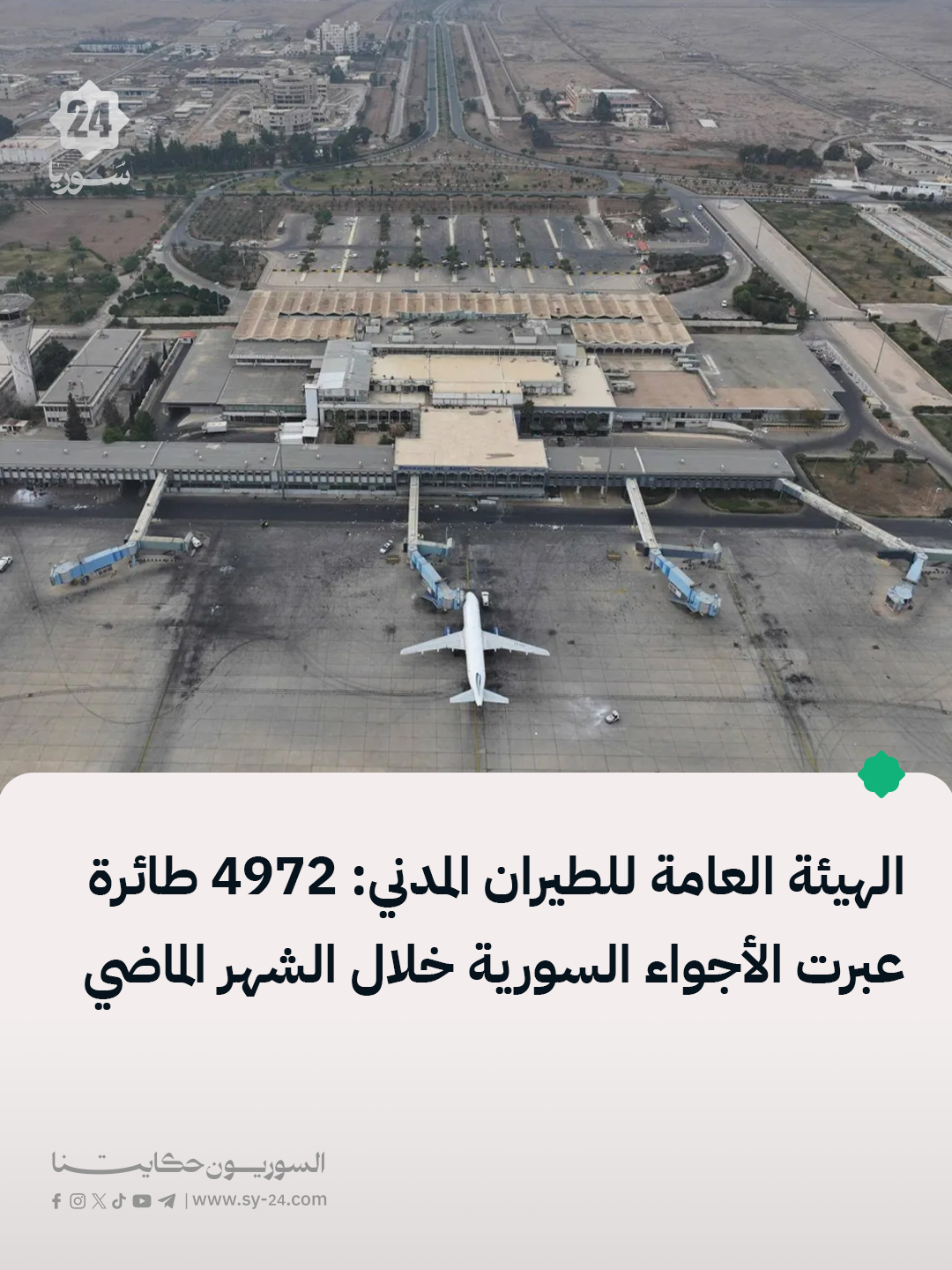الهيئة العامة للطيران المدني السوري: بلغ عدد الطائرات العابرة للأجواء السورية 4972 طائرة خلال شهر كانون الأول 2025. سجّل العدد ارتفاعاً بنسبة تقارب 18٪ مقارنة بشهر تشرين الثاني الذي سبقه. The post الهيئة العامة للطيران المدني: 4972 طائرة عبرت الأجواء السورية خلال الشهر الماضي appeared first on SY24 .