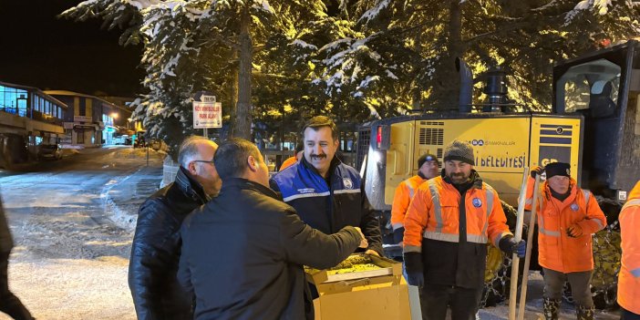 Sivas'ın Suşehri ilçesinde karla mücadele eden ekipler, gece gündüz demeden yolları açık tutmak için büyük bir özveri gösteriyor. İlçe yönetimi, fedakâr personeline tatlı ikram ederek teşekkür etti.