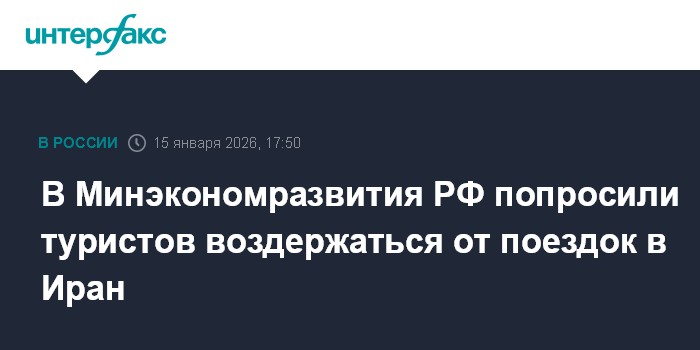 Минэкономразвития РФ в связи с обострением ситуации в Иране рекомендовало россиянам воздержаться от поездок в эту страну и попросило туркомпании довести эту информацию до туристов."В связи с обострением ситуации с безопасностью в Иране гражданам России стоит воздержаться от поездок в Иран до официальных уведомлений.