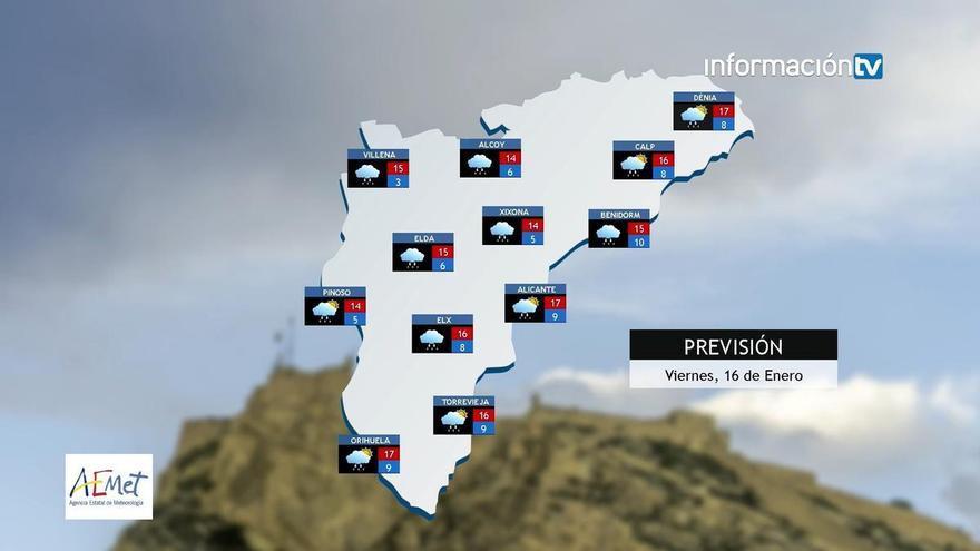 A lo largo del día, la nubosidad será abundante, con predominio de cielos cubiertos. En las comarcas del norte y el litoral, localidades como Dénia, Calp o Benidorm registrarán lluvias intermitentes, que podrán ser más persistentes durante las primeras horas. Las temperaturas máximas se moverán entre los 15 y 17 grados, con un ambiente fresco y húmedo.