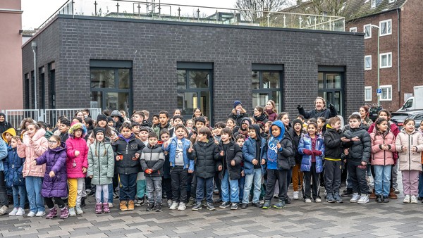 Pleiten, Kabelklau, Vandalismus: Nach Jahren hat die Grundschule Hochfelder Markt einen neuen Anbau. OB Link musste sich von den Kindern einiges anhören.