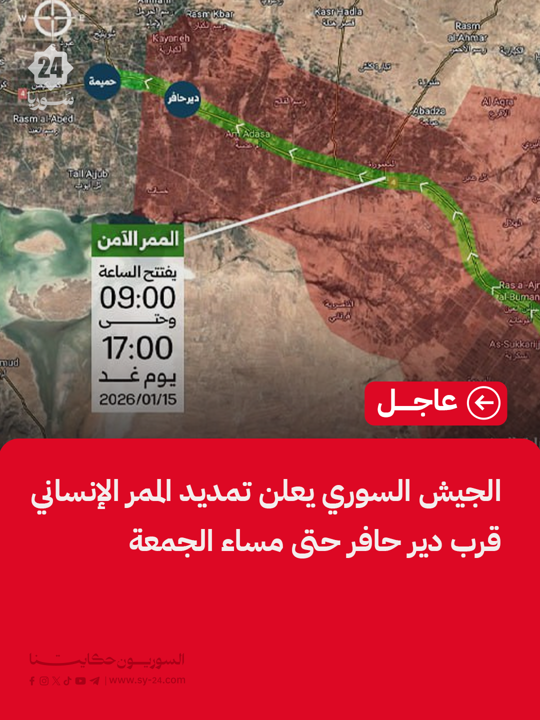 الجيش السوري يعلن تمديد الممر الإنساني قرب دير حافر حتى مساء الجمعة هيئة العمليات في الجيش العربي السوري لوكالة سانا: تمديد مدة الممر الإنساني ليوم إضافي يوم الجمعة من الساعة 09:00 صباحاً وحتى 17:00 مساءً. سيتم استهداف أي موقع يعرقل مرور المدنيين بالطريقة المناسبة. الانتهاء من كافة التحضيرات الميدانية لتأمين المنطقة. نهيب بأهلنا المدنيين الابتعاد فوراً عن […] The post الجيش السوري يعلن تمديد الممر الإنساني قرب دير حافر حتى مساء الجمعة appeared first on SY24 .