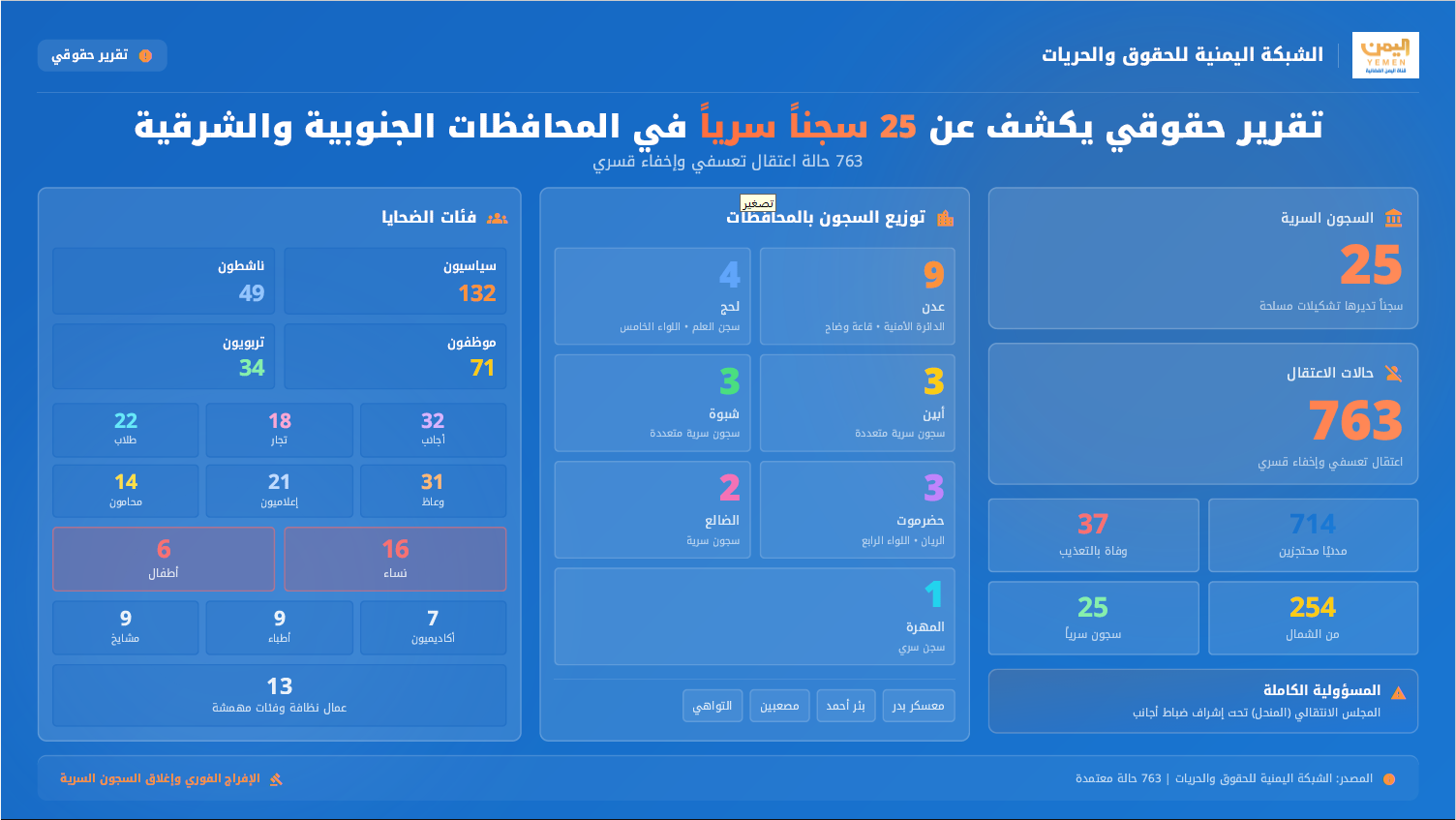 كشفت الشبكة اليمنية للحقوق والحريات عن وجود 25 سجناً سرياً تديرها التشكيلات المسلحة التابعة للمجلس الانتقالي (المنحل) خارج إطار الدولة، في عدد من المحافظات الجنوبية والشرقية، وبإشراف ضباط أجانب، مؤكدة أن هذه السجون تعمل كمنظومة احتجاز مغلقة لا تخضع لسلطة القضاء أو رقابة النيابة العامة، وتمثل انتهاكاً مباشراً لسيادة الدولة ووحدانية قرارها الأمني والقضائي. وبحسب … The post تقرير حقوقي يكشف عن 25 سجناً سرياً و763 حالة اعتقال وإخفاء قسري في المحافظات الجنوبية والشرقية appeared first on قناة اليمن الفضائية .