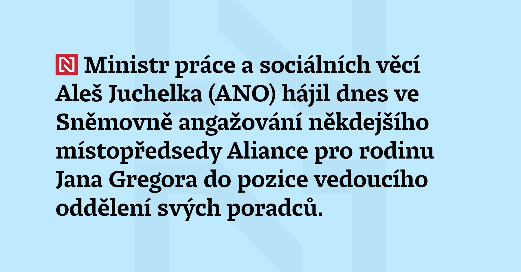 Ministr práce a sociálních věcí Aleš Juchelka (ANO) hájil dnes ve Sněmovně angažování někdejšího místopředsedy Aliance pro rodinu Jana Gregora do pozice vedoucího oddělení svých poradců. Na Gregora se ptala pirátská poslankyně Barbora Pipášová, která se pozastavovala nad jeho názory a Alianci pro rodinu označila za politickou neziskovku. „Pan Gregor ukončil své působení ve vedení Aliance pro […]