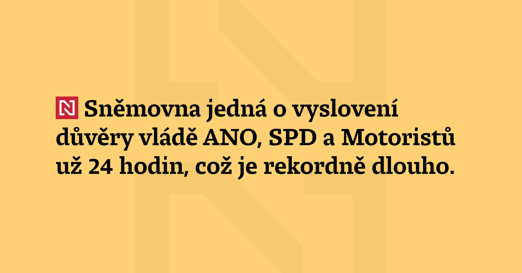 Sněmovna jedná o vyslovení důvěry vládě ANO, SPD a Motoristů už 24 hodin, což je rekordně dlouho. V debatě chtějí vystoupit ještě čtyři poslanci. (ČTK)