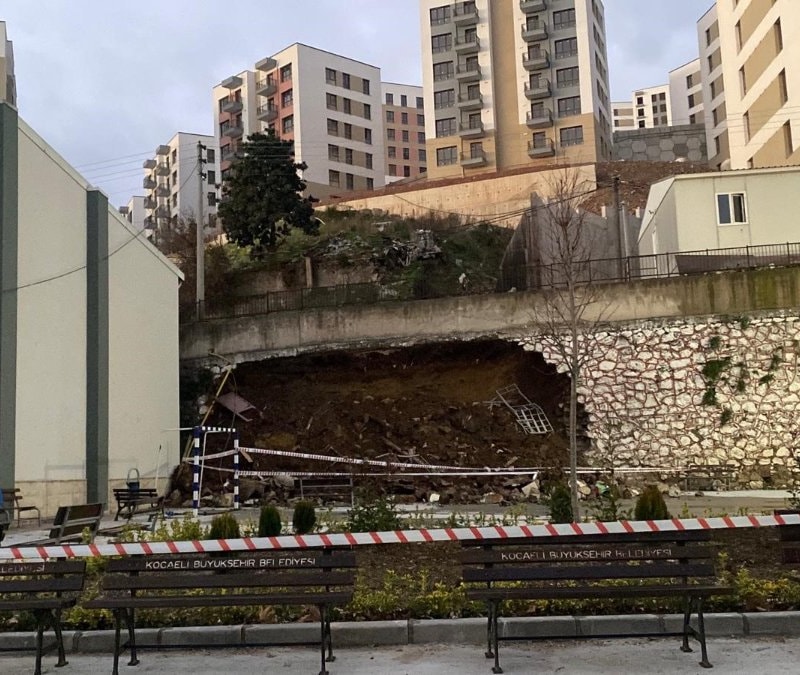 İzmit ilçesinde inşaat alanı ile lise arasındaki yaklaşık 10 metre yüksekliğindeki istinat duvarı okulun bahçesine çöktü. Olayda yaralanan olmazken duvarın çökme anı cep telefonu kamerası tarafından kaydedildi.