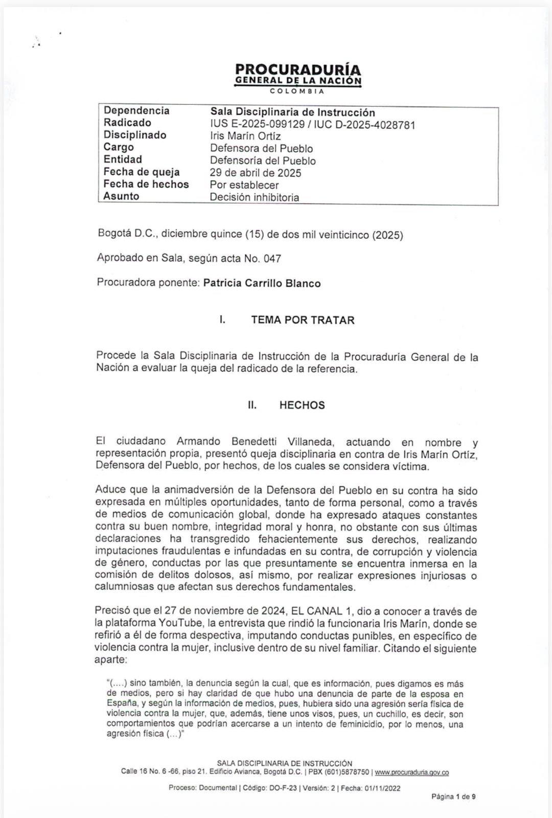 En un fallo emitido por su Sala Disciplinaria de Instrucción, este jueves la Procuraduría General se abstuvo de abrir una investigación en contra de la defensora del Pueblo, Iris Marín , quien fue denunciada por el Ministro del Interior, Armando Benedetti , señalándola de supuestos ataques contra su buen nombre, integridad moral y honradez. Lea más: “Su nombramiento alienta el machismo”: defensora del Pueblo pide mantener al margen del Gobierno a Armando Benedetti Según el funcionario, Marín profirió “imputaciones fraudulentas e infundadas” en su contra, acusándolo de corrupción y violencia de género. En particular, tras la entrevista que ofreció la defensora en noviembre pasado al medio Canal 1. “(....) sino también, la denuncia según la cual , que es información, pues digamos es más de medios, pero sí hay claridad de que hubo una denuncia de parte de la esposa en España , y según la información de medios, pues, hubiera sido una agresión seria física de violencia contra la mujer , que, además, tiene unos visos, pues, un cuchillo, es decir, son comportamientos que podrían acercarse a un intento de feminicidio, por lo menos, una agresión física”, dijo la defensora. Benedetti reclamó también que en febrero pasado la defensora criticó su nombramiento como ministro del Interior, señalándolo por violencia contra la mujer. “Creo que no es una decisión conveniente ni respetuosa de los riesgos en derechos humanos y de violencia contra la mujer. Tener un funcionario que tiene estas acusaciones tan serias, no solo de violencia de género, sino también de corrupción. Si efectivamente es nombrado ministro, la Defensoría del Pueblo se articulará con el funcionario que esté a cargo, manteniendo su posición sobre su nombramiento”. Sin embargo, para la Procuraduría Las expresiones de Marín no se consideran injuriosas o calumniosas. En esa línea, el ente citó informes de prensa sobre la denuncia que se presentaría ante la Corte Suprema de Justicia contra Benedetti por el Presunto caso de violencia intrafamiliar contra su pareja, Adelina Guerrero, cuando este se desempeñaba como embajador ante la FAO, así como de la denuncia presentada por Laura Sarabia, como víctima de presunta violencia de género. A ello se suma el llamado a juicio contra Benedetti que ordenó en febrero de 2025 la Sala de Instrucción de la Corte Suprema de Justicia, por de influencias en el escándalo de corrupción de tráfico del caso Fonade (Fondo Financiero de Proyectos de Desarrollo). “Por lo anterior, no se advierte que se hubiere realizado la imputación falsa de una conducta delictiva , pues como se observa, las apreciaciones realizadas por la funcionaria, se circunscribieron a hacer alusión a las acusaciones atribuidas al señor Armando Benedetti, a partir de las cuales, expresó su opinión en torno a la inconveniencia de su nombramiento como ministro del Interior”, señaló la Procuraduría. Entre otras, el ente de control citó pronunciamientos de la Corte Suprema de Justicia, en los que se precisa que las imputaciones por injuria o calumnia deben tener la suficiente solidez “para lesionar de manera real y efectiva el buen nombre o la honra de la persona afectada”. Además, ratificando el derecho a la libertad de expresión, la Procuraduría recordó que una de las obligaciones que implica ser servidor público es “la carga de soportar un mayor escrutinio de sus actividades personales y funcionales”.