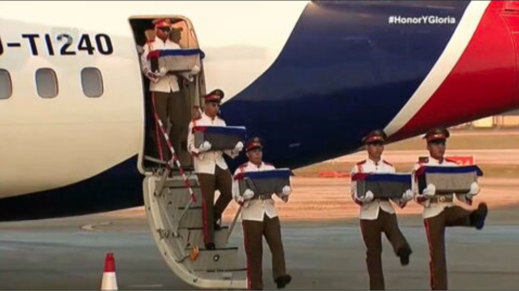 HAVANA (AP) — Trumpets and drums played solemnly at Havana’s airport Thursday as white-gloved Cuban soldiers marched out of a plane carrying urns with remains...