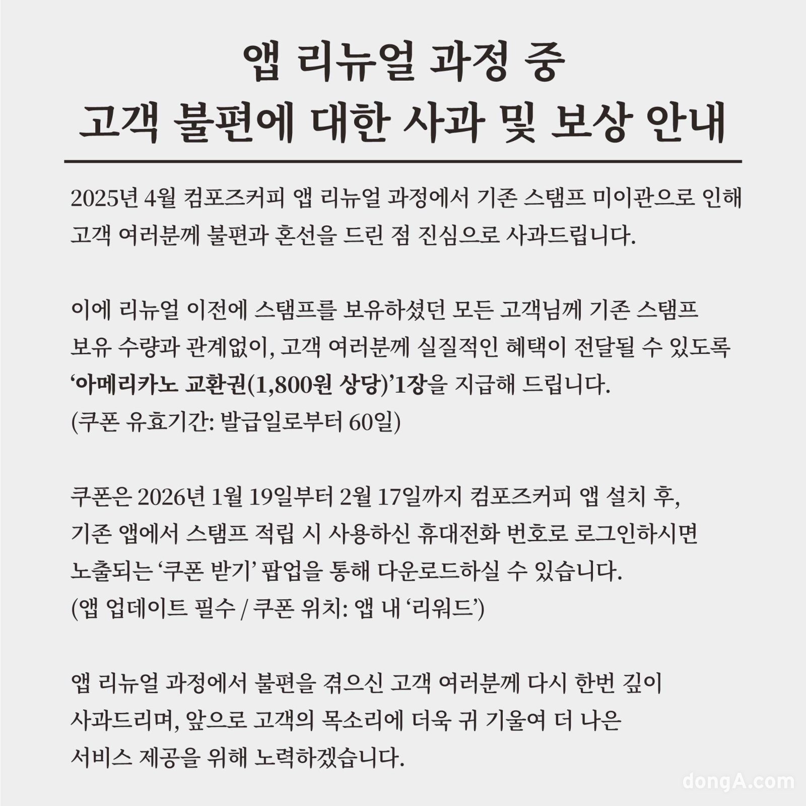 국내 대표 커피 프랜차이즈 브랜드 컴포즈커피가 지난해 앱 리뉴얼 과정에서 불편을 겪은 고객들을 대상으로 보상 절차를 개시했다.컴포즈커피는 지난해 4월 고객 편의 증대를 위해 개별 가맹점별로 운영되던 스탬프 적립 방식을 전국 가맹점 통합 적립 시스템으로 바꿨다. 이를 통해 컴포즈커피 고객은 특정 매장에 한정되지 않고, 전국 어느 매장에서나 동일하게 스탬프를 적립하고 사용할 수 있게 됐다.다만 이 과정에서 기존에 적립된 스탬프가 이관되지 않으면서 일부 고객에게 혼선과 불편이 발생한 점을 인정했다.이에 컴포즈커피는 앱 리뉴얼 이전 스탬프를 보유했던 모든 고객을 대상으로, 기존 스탬프 보유 수량과 관계없이 ‘아메리카노 교환권(1800원 상당)’ 1장을 지급하기로 결정했다. 컴포즈커피는 고객에게 실질적인 혜택이 전달될 수 있는 보상 방안을 마련하는 과정에서 시스템 점검과 운영 검토가 필요, 그로 인해 보상 안내까지 다소 시간이 소요된 점에 대해서도 유감의 뜻을 밝혔다.해당 교환권은 1