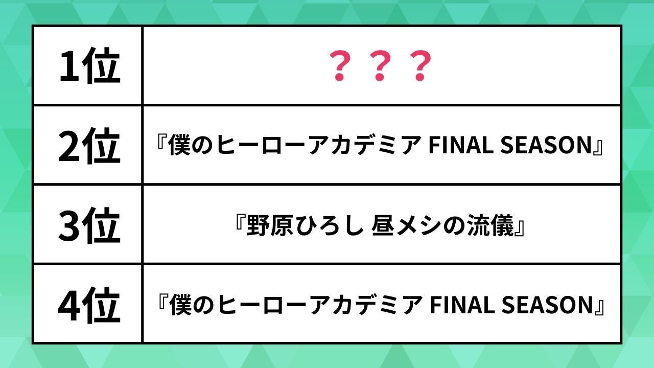 人気の「アニソン」カラオケランキング 第一興商は、DAMにおける2025年秋クール放送・配信のアニメ主題歌を対象としたカラオケランキングを調査。その結果を1月13日に公開しました。 アニソン界の権威である音楽評論家・冨田明宏さんの解説も併せて紹介します。さっそくランキングを見ていきましょう。 人気の「アニソン」カラオケランキング TOP10 10位 『最後にひとつだけお願いしてもよろしいでしょうか』戦場の華/CHiCO with HoneyWorks 9位 『キングダム 第6シリーズ』生きて、燦々/いきものがかり 8位 『ワンダンス』Stare In Wonder/BE:FIRST 7位 『キングダム第6シリーズ』咆哮/友成空 6位 『ディズニー ツイステッドワンダーランド ザ アニメーション』Piece of my world (The Animation ver)/Night Ravens 5位 『SPY×FAMILY Season 3』灯を護る/スピッツ 4位 『僕のヒーローアカデミア FINAL SEASON』THE REVO/ポルノグラフィティ 3位 『野原ひろし 昼メシの流儀』ごはん食べヨ/Mega Shinnosuke 3位はMega Shinnosuke。アニメが思わぬ形でヒットしたことも大きいですが、新進気鋭のシンガーソングライターであるMega Shinnosukeの洒脱で心地良いメロディラインが視聴層である中高年層の胃袋とハートをガッシリとつかんだようです。 2位 『僕のヒーローアカデミア FINAL SEASON』I /BUMP OF CHICKEN 2位はついに完結した『僕のヒーローアカデミア FINAL SEASON』のOPテーマがランクイン。国民的人気を誇るBUMP OF CHICKENの曲で『ジャンプ』アニメの強靭さを見せつけました。 1位 『クレヨンしんちゃん』はちゃめちゃわちゃライフ!/FRUITS ZIPPER 1位は『クレヨンしんちゃん』の作品性が奏功したこの曲。作詞・作曲はCANDY TUNE「倍倍FIGHT!」でもおなじみであるWiennersの玉屋2060%さん。今後彼の活躍からますます目が離せないです。 【あわせて読みたい】 「冬アニメ」期待度ランキング2026。【推しの子】や葬送のフリーレン2期を抑えた1位が納得だった Related... 【呪術廻戦】直哉・脹相・乙骨の作者イラストがカッコ良すぎる。「チョイスが最高」「表情が良い」と話題に 【ジョジョの奇妙な冒険】作者の年賀状、渋くてかっこいいと反響。「先生のエネルギーすごい」「かっこよすぎる」の声続々 「歴代ガンダム最強パイロット」ランキング。シャア、ハマーン・カーンを抑えた1位は誰?【2025年回顧】 ...クリックして全文を読む