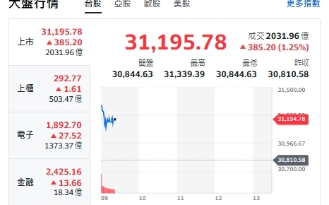 Newtalk新聞 美國正式宣布對台關稅降至15%,台股今天(16日)開盤就狂飆近350點,一度飆漲400點,站上31195點,最高來到31339點。上櫃、電子與金融類股全揚升!重要電子權值股,約9點20分前,台積電衝漲35元、來到1725元。鴻海平盤、維持233.5元。廣達漲4.5元、來到287.5元。聯發科漲5元、來到1495元。台達電漲25元、來到1070元。 分析師葉俊敏表示,台股支撐30000點,續攻31500〜32000,台積電法說超強,台積電與台積鏈是長線主流。OTC多頭看支撐 282點。市值前二大一直漲,推動OTC上漲:群聯1810創新高、信驊8890創新高,與股王信驊衝到快9000,台股出現10000元股王。 ※Newtalk提醒您: #投資一定有風險,投資有賺有賠,投資前應檢視自身能力,申購前應詳閱公開說明書。 延伸閱讀: 台股開盤》電子權值F4跌 大盤跌逾百點 一線績優股名單來了 台積電變「美積電」?多蓋5廠換關稅15% 專家直言「台美更緊密」非常可以接受 嘉義縣觀光產業輔導成果發表 翁章梁:為迎接黃金10年做好準備 財報超亮眼!台積電2025年第四季每股賺19.5元 台積電擴大美國投資 特化材料供應鏈受惠名單曝光