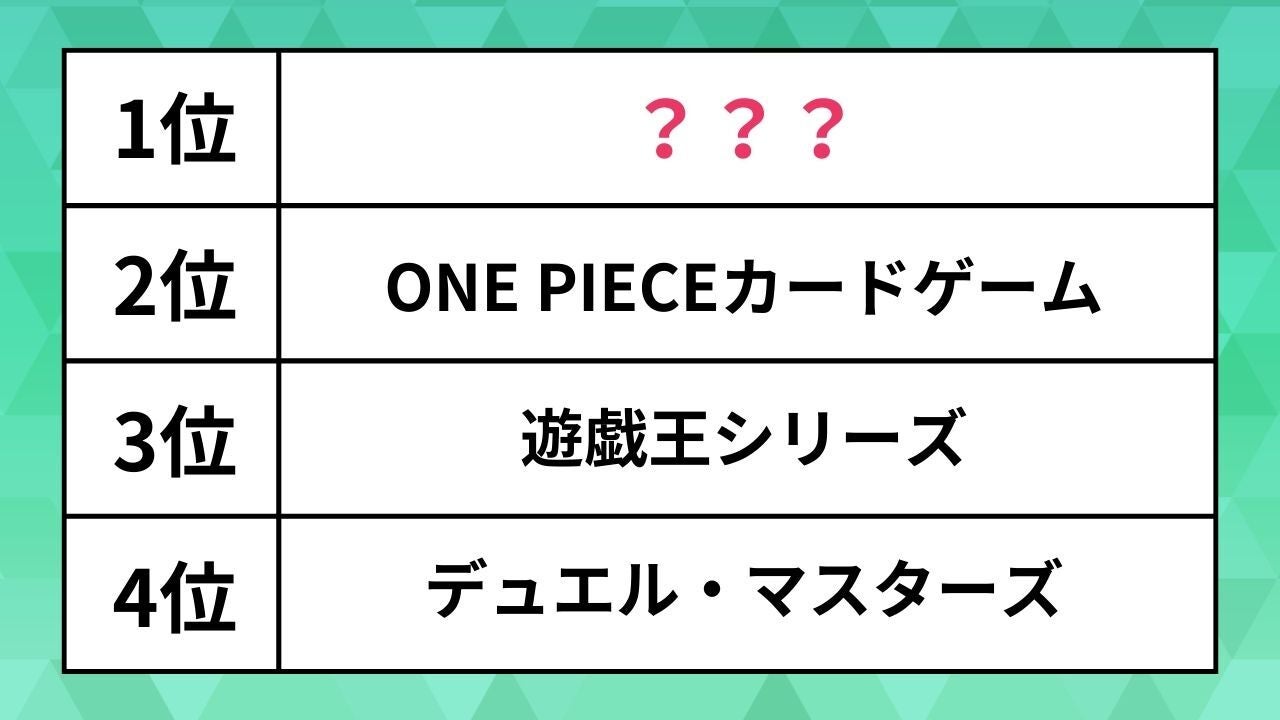知育ゲームの開発・販売を行うtanQは1月14日、カードゲームで遊んだことがある、小学生の子を持つ親に聞いた「小学生に人気のカードゲーム」などに関する調査結果を 発表しました 。 調査は、2025年11月25日から12月2日、関東一都三県(東京都、神奈川県、千葉県、埼玉県)に住む小学生の親400人を対象に、インターネット上で実施しました。気になるランキング結果をみていきましょう。 「小学生に人気のカードゲーム」ランキング 第10位:カンジモンスターズ 12.8% 第9位:シャドウバース EVOLVE 13.5% 第8位:蟲神器(むしじんぎ) 14% 第7位:カードファイト‼ヴァンガード 14% 第6位:デジモンカードゲーム 14.3% 第5位:バトルスピリッツ 15% 第4位:デュエル・マスターズ 19% 第3位:遊戯王シリーズ 22.5% 第2位:ONE PIECEカードゲーム 24.8% 第1位:ポケモンカードゲーム 69.3% ベスト3には、「ポケモンカードゲーム」「ONE PIECEカードゲーム」「遊戯王シリーズ」が選ばれました。1位の「ポケモンカードゲーム」は、約70%の小学生が遊んだことがあるという人気っぷり。 また、「親子でカードゲームをした経験」についても、79.3%の人が一緒に遊んだことがあることが分かりました。 【あわせて読みたい】 【ひと目で分かる】「18歳」になったらできること、「20歳」にならないとできないこと Related... 人気の「カラオケ曲」ランキング。あいみょんや嵐、星野源の名曲を抑えた1位は? 人気の「アニソン」カラオケランキング。ヒロアカやスパイファミリー主題歌を抑えた1位は? ユニクロから「呪術廻戦」や「キングダム」などコラボTシャツ→「うおお、まじか」「最高にほしい」と話題に ...クリックして全文を読む
