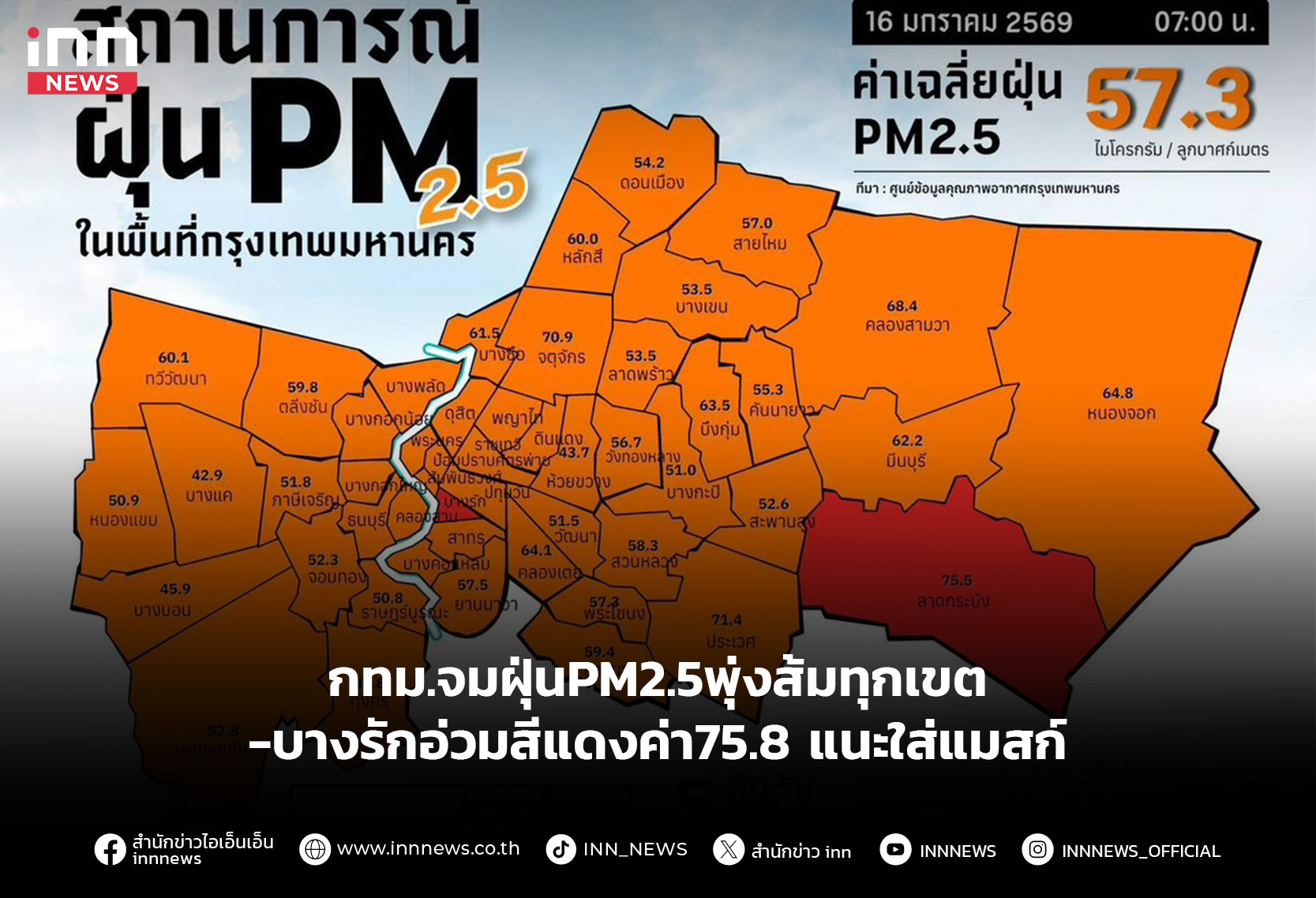 กทม.จมฝุ่นPM2.5พุ่งส้มทุกเขต -บางรักอ่วมสีแดงค่า75.8แนะใส่แมสก์