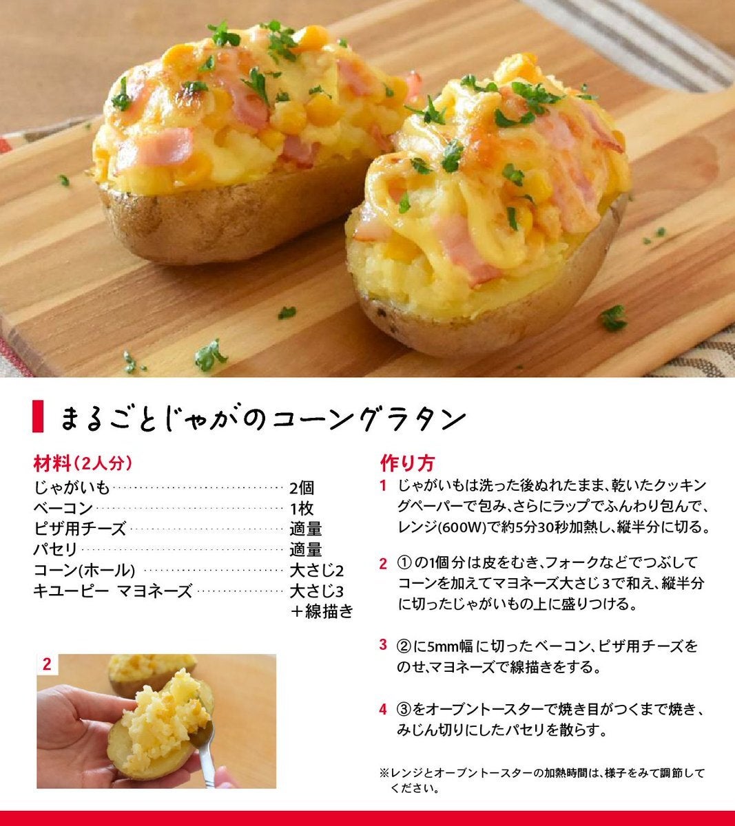 キユーピーが公式X(@kewpie_official)で、「まるごとじゃがコーングラタン」のレシピを紹介しました。オーブントースターで簡単に出来る、心と体が温まるほくほくした一品です。さっそくレシピを見ていきましょう。 「まるごとじゃがコーングラタン」 【材料】2人分 じゃがいも:2個 ベーコン:1枚 ピザ用チーズ:適量 パセリ:適量 コーン(ホール):大さじ2 キユーピーマヨネーズ:大さじ3+線描き 【作り方】 1.洗って濡れたままのじゃがいもを、乾いたクッキングペーパーで包む。さらに、ラップでふんわり包み、レンジ(600W)で、約5分30秒加熱し、加熱し、縦半分に切る。 2.加熱したじゃがいも1個分は皮を剥き、フォークで潰して、コーンとマヨネーズで和え、縦半分に切ったじゃがいもの上に盛り付ける。 3.盛り付けをしたじゃがいもに、5mm幅に切ったベーコン、ピザ用チーズをのせてマヨネーズで線描きする。 4.じゃがいもをオーブントースターで、焼き目が付くまで焼き、みじん切りしたパセリを散らす。 完成! (引用元: @kewpie_official ) 【画像】 トースターで手軽に完成!じゃがいもの丸ごとグラタンのレシピ 【あわせて読みたい】 「中道とは?」立憲・公明の各代表の考えは。「中道勢力の結集」打ち出し新党結成へ Related... 【画像】「じゃがいも」のまるごとグラタンレシピ!簡単でホクホクすぎると話題 豚肉の「かさまし」レシピが最強すぎた!レンジで簡単、「アレ」を使えば美味しく健康! 鶏むね肉の「イチオシ」レシピは?キユーピーが紹介した「みそマヨ」レシピが簡単すぎるのに美味 ...クリックして全文を読む