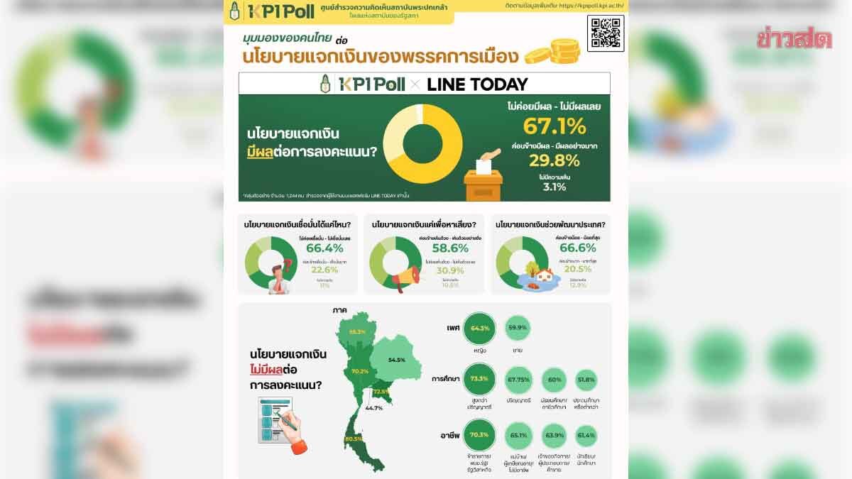 พระปกเกล้าโพล คนไทย 2 ใน 3 ไม่คล้อยตามนโยบายแจกเงิน ชี้การเมืองที่หวังชนะด้วยเงิน ไม่ตอบโจทย์ประชาชน กระตุ้นทุกพรรค เสนอนโยบายใหม่ที่ไม่ใช่ประชานิยม วันที่ 16 ม.ค.2569 สถาบันพระปกเกล้า เผยผลสำรวจ KPI POLL เรื่อง “มุมมองของคนไทยต่อนโยบายแจกเงินของพรรคการเมือง” สำรวจ ระหว่างวันที่ 26-29 ธ.ค.2568 จากประชาชนที่มีอายุ 18 ปีขึ้นไป กระจายตามภูมิภาคทั่วประเทศ จำนวน 2,000 ตัวอย่าง โดยมีบทสรุปสำคัญจากผลสำรวจ ดังนี้ 1.คนไทย 2 ใน 3 “ไม่เชื่อ” และ “ไม่คล้อยตาม” นโยบายแจกเงิน โดย 67.1% ระบุว่าไม่ส่งผลต่อการตัดสินใจเลือกตั้ง (สำรวจโดย x LINE TODAY) 66.4% ไม่เชื่อมั่นนโยบายแจกเงิน 58.6% มองว่าเป็นนโยบายเพื่อหาเสียง 66.6% เห็นว่าช่วยพัฒนาประเทศได้น้อยหรือแทบไม่ช่วยเลย กรณีนี้ สะท้อนว่า […]